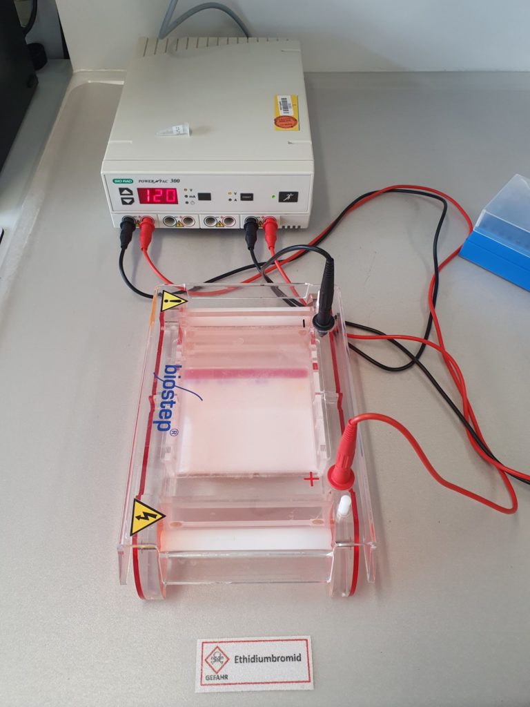 Hierbei wurde zunächst mittels Restriktionsverdau und anschließender Agarose-Gelelektrophorese der erfolgreiche Einbau von Fremd-DNA in ein Plasmid geprüft. Anschließend wurden die Plasmide durch Transformation in kompetente Zellen eingeschleust. Und schließlich erfolgte die Selektion der Bakterien mit Plasmid und Fremd-DNA mithilfe einer auf dem Plasmid codierten Antibiotikaresistenz, die ein Wachstum auf einem entsprechenden Nährmedium ermöglichte. Am Ende wurden schließlich die Bakterien, die das Plasmid mit der Fremd-DNA besaßen, zum Leuchten gebracht.