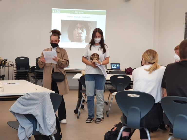 Im Rahmen des Biologieunterrichts besuchte die Klasse 10 der Gesamtschule das Museum für Naturkunde in Berlin. Zunächst nahm sie an einem Workshop zum Thema „Evolution des Menschen“ teil. Nach einer kurzen Einführung in das Thema Evolution und Darwins Evolutionstheorie konnten die Schülerinnen und Schüler anhand von Schädelvergleichen Gemeinsamkeiten und Unterschiede verschiedener Hominini-Arten identifizieren. So ließ sich die Entwicklung des Menschen durch anatomische Veränderungen, z. B. im Verhältnis von Gesichts- zu Gehirnschädel (als Hinweis auf eine zunehmende Gehirngröße) und in der Lage des Hinterhauptloches (als Hinweis auf einen zunehmend aufrechten Gang), nachvollziehen.
