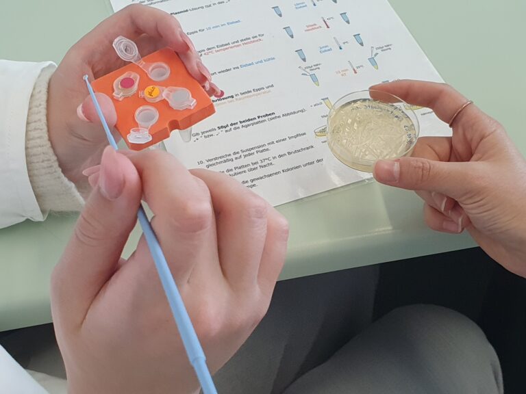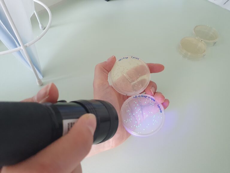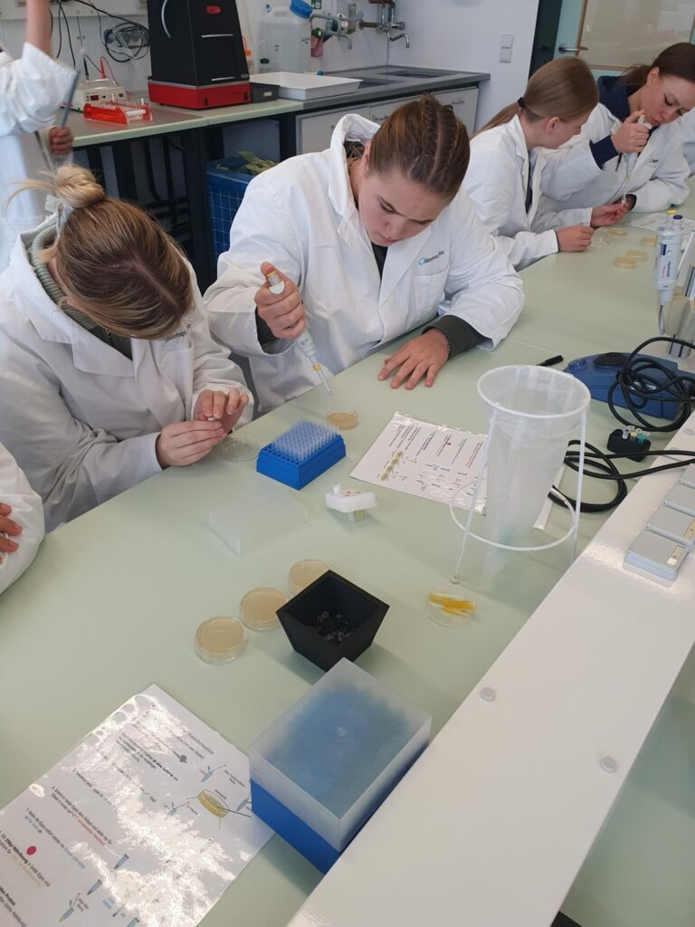 Am 10.10.2023 besuchte die Klasse 13 im Rahmen des Biologieunterrichts das Gläserne Labor Berlin-Buch und absolvierte dort einen vierstündigen Laborkurs zum Thema „Klonierung – Restriktionsenzyme und Transformation“. Ziel war es, mithilfe molekularbiologischer Methoden gentechnisch modifizierte Bakterien zu erzeugen, die aufgrund der Expression eines grün-fluoreszierenden Proteins (GFP), welches natürlicherweise in einer Tiefseequallenart zu finden ist, bei Anregung mit UV-Licht leuchten. Viele Arbeitsschritte sind dabei nötig, bis am Ende leuchtende Bakterienkolonien bewundert werden können. Da der Gesamtprozess den zeitlichen Rahmen des Workshops sprengen würde, wurde ein wenig „getrickst“. Die von uns mit einem GFP-codierenden Plasmid transformierten Bakterien mussten erst über Nacht zu sichtbaren Kolonien heranwachsen. Daher haben wir die Ergebnisse einer Gruppe vom Vortag ausgewertet, die aber – wie hoffentlich auch wir – beste Arbeit geleistet und leuchtende Kolonien erzeugt haben.