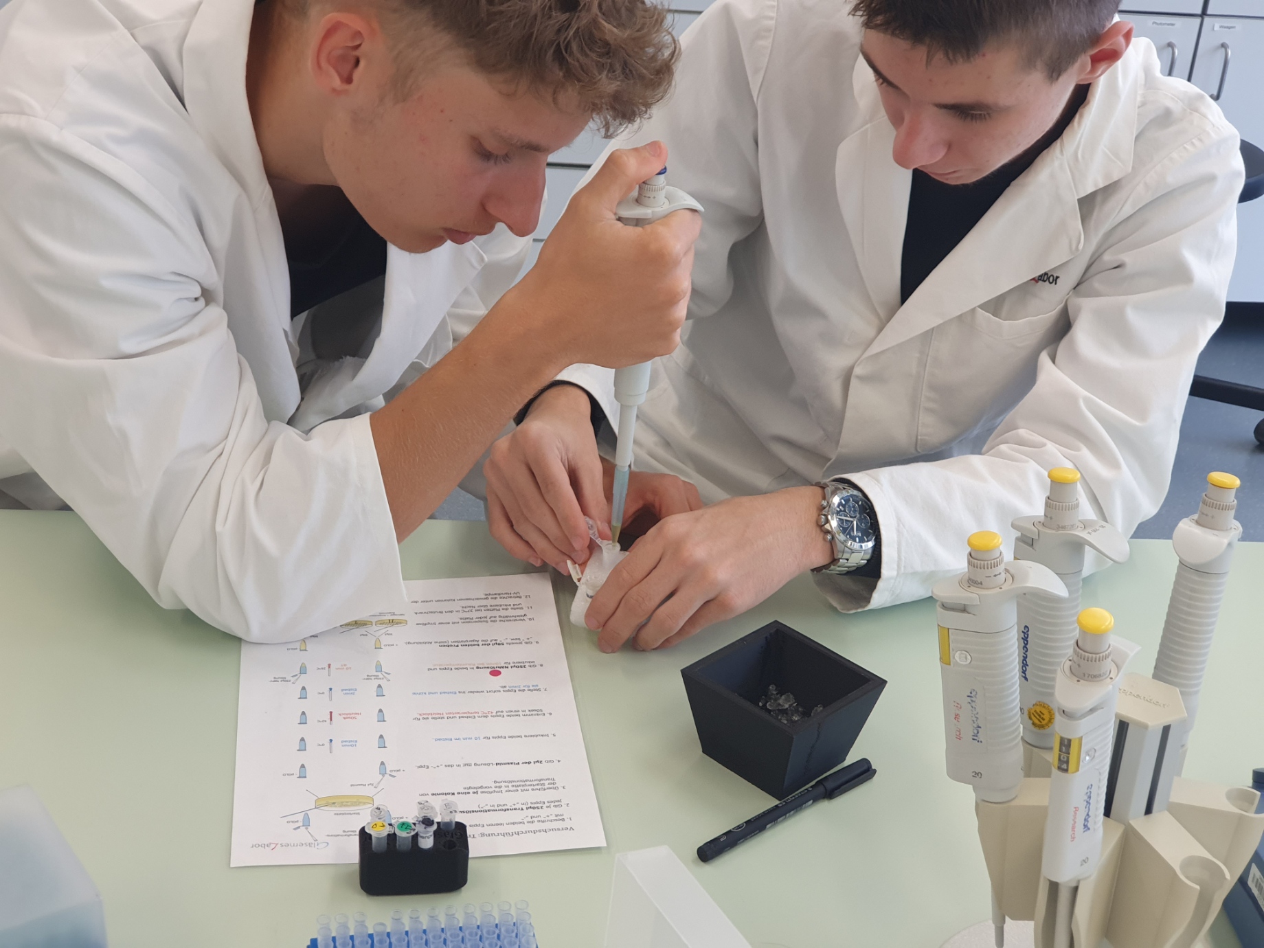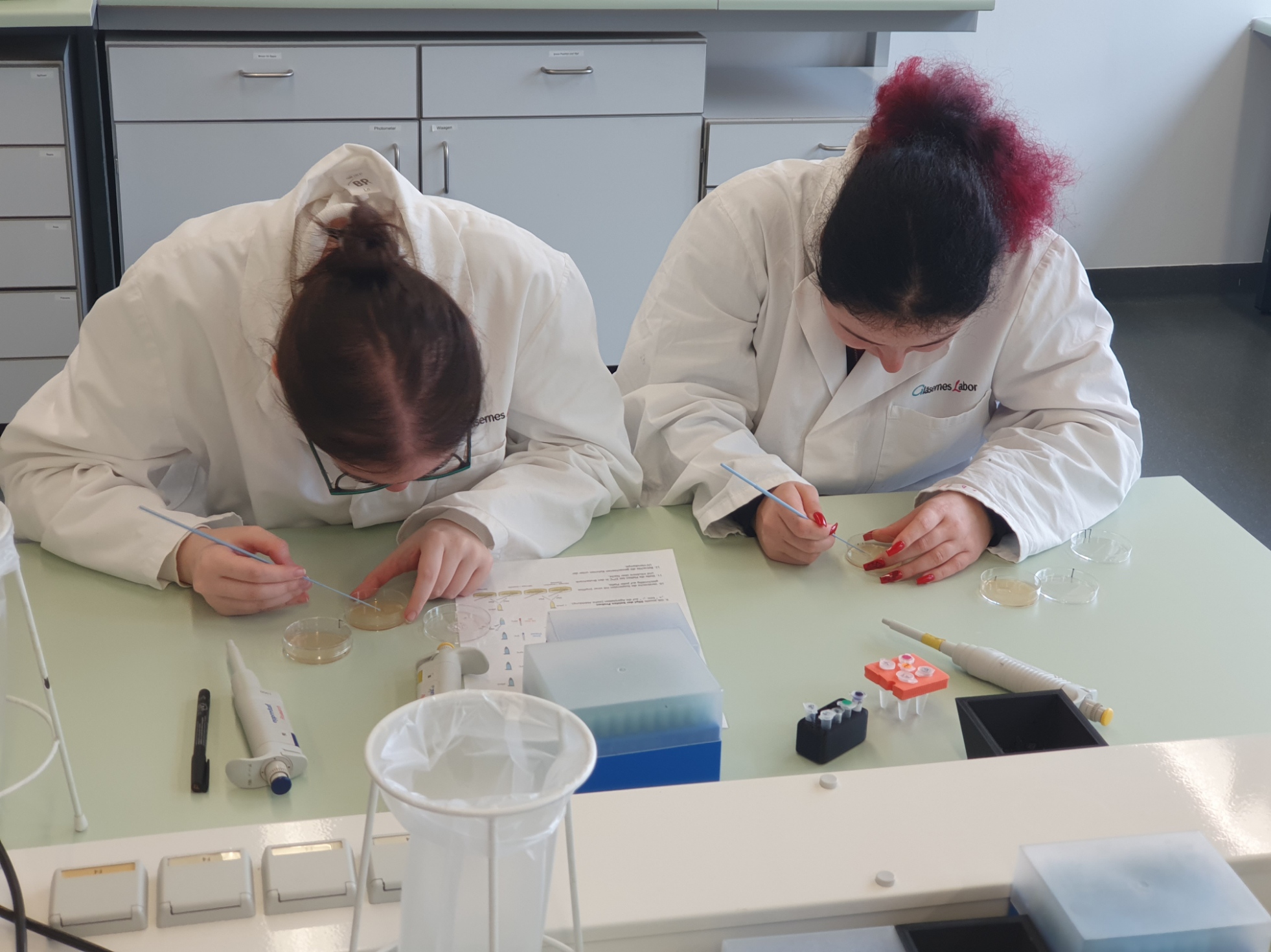 Am 10.10.2023 besuchte die Klasse 13 im Rahmen des Biologieunterrichts das Gläserne Labor Berlin-Buch und absolvierte dort einen vierstündigen Laborkurs zum Thema „Klonierung – Restriktionsenzyme und Transformation“. Ziel war es, mithilfe molekularbiologischer Methoden gentechnisch modifizierte Bakterien zu erzeugen, die aufgrund der Expression eines grün-fluoreszierenden Proteins (GFP), welches natürlicherweise in einer Tiefseequallenart zu finden ist, bei Anregung mit UV-Licht leuchten. Viele Arbeitsschritte sind dabei nötig, bis am Ende leuchtende Bakterienkolonien bewundert werden können. Da der Gesamtprozess den zeitlichen Rahmen des Workshops sprengen würde, wurde ein wenig „getrickst“. Die von uns mit einem GFP-codierenden Plasmid transformierten Bakterien mussten erst über Nacht zu sichtbaren Kolonien heranwachsen. Daher haben wir die Ergebnisse einer Gruppe vom Vortag ausgewertet, die aber – wie hoffentlich auch wir – beste Arbeit geleistet und leuchtende Kolonien erzeugt haben.