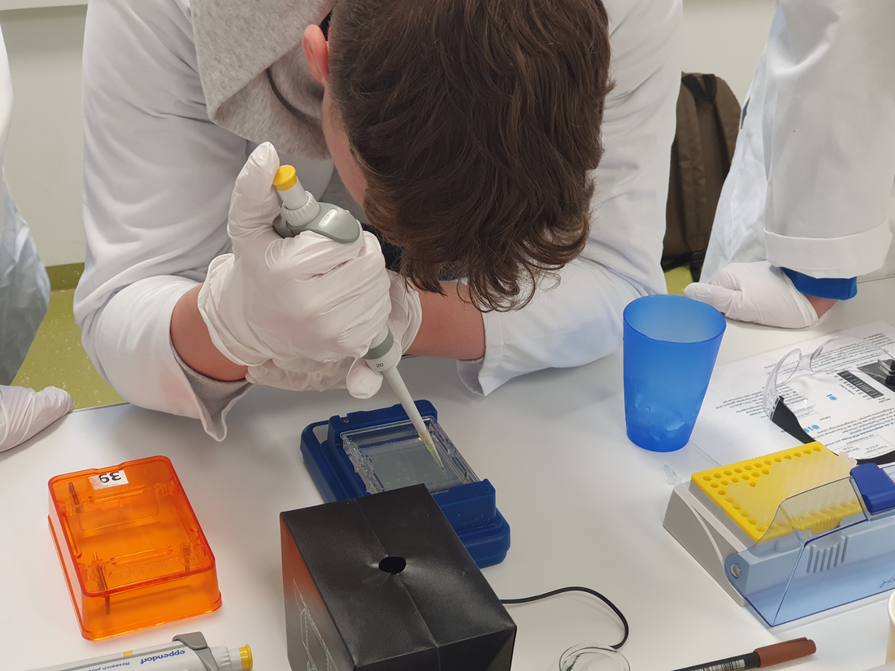 „Im Rahmen eines Biologie-Projekts hatten unsere beiden elften Klassen die Aufgabe, einen fiktiven Kriminalfall zu lösen: Nach dem mysteriösen Verschwinden einer Frau wurden in den Autos zweier Tatverdächtiger Haarproben sichergestellt, aus denen DNA-Proben aufbereitet und den Schülerinnen und Schülern zur weiteren Untersuchung zur Verfügung gestellt wurden. Mithilfe molekularbiologischer Methoden sollten sie ermitteln, ob eine der beiden Proben der verschwundenen Frau zugeordnet werden kann. Eine genetisch bedingte Erkrankung der Frau erleichterte hierbei die Analyse, da das Gen „CFTR“ bei ihr nur halb so lang war wie bei einem gesunden Menschen. Nach Vervielfältigung des für die Untersuchung relevanten DNA-Abschnitts mittels Polymerasekettenreaktion (PCR) erfolgte die Auftrennung und Sichtbarmachung der entstandenen Fragmente durch Agarose-Gelelektrophorese. Zum Vergleich wurde bei der Untersuchung auch eine Positiv- und eine Negativkontrolle mitgeführt. Schlussendlich konnte der Täter so von beiden Klassen ermittelt werden.