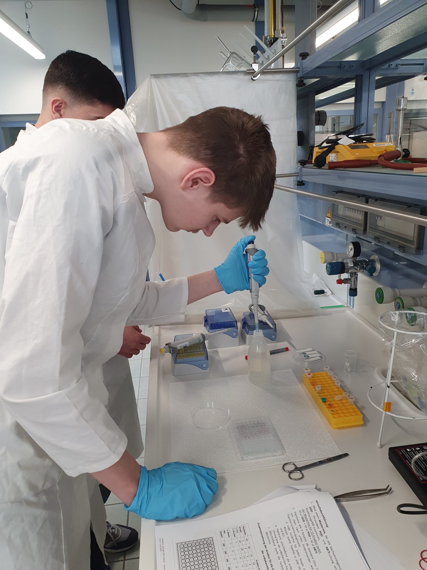 Am 24. Februar 2023 besuchte die Klasse 11 die Technische Hochschule Wildau und absolvierte dort den Schülerlaborkurs „Glucose-Biosensor“. Nach einer theoretischen Einführung über verschiedene Möglichkeiten des qualitativen und quantitativen Nachweises von Glucose in Lösungen wurden die vorgestellten Methoden praktisch durchgeführt. Das Enzym Glucoseoxidase spielte für die Versuche dabei eine Schlüsselrolle. Es katalysiert die Oxidation von Glucose durch Sauerstoff. Die Umsetzung kann über eine anschließende Farbreaktion nachgewiesen werden. Auf diese Weise galt es z.B. Cola von Cola light zu unterscheiden und den Glucosegehalt einer unbekannten Probe mithilfe einer zuvor erstellten Eichkurve zu ermitteln. In einem dritten Versuch wurde schließlich über die Stärke der Sauerstoffabnahme während der Glucoseoxidase-Reaktion indirekt auf die Glucosemenge in einer Lösung geschlossen.