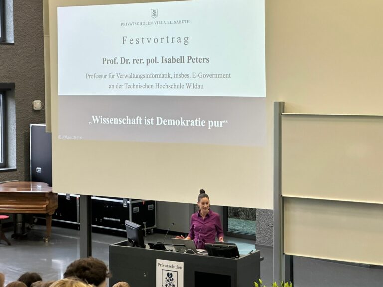 Als Festrednerin konnte diesmal Prof. Dr. rer. Pol. Isabel Peters, Professorin an der TH Wildau für E-Government, gewonnen werden. Sie beschäftigt sich mit der digitalen Verwaltung in Deutschland und wie diese erfolgreich gestaltet werden kann. In Ihrer Rede verwies Frau Peters darauf, dass Wissenschaft Demokratie pur sei. Grund hierfür ist, dass Jeder, der an einem Thema besonders interessiert ist, wissenschaftlich arbeiten kann. Dabei seien auch kleine Fortschritte wichtig, eine Doktorarbeit sei nicht immer notwendig. Veröffentlichungen wissenschaftlicher Arbeiten erreichen in Zeiten digitaler Medien immer schneller immer mehr Menschen. Daraus erwachse auch eine Verantwortung für die sich mit wissenschaftlichen Themen beschäftigenden. Zudem thematisierte sie das Thema Fehler und ermutigte die Wettbewerbsteilnehmer sich von Misserfolgen nicht entmutigen zu lassen. Auch Fehler führen schlussendlich zu einem Fortschritt.