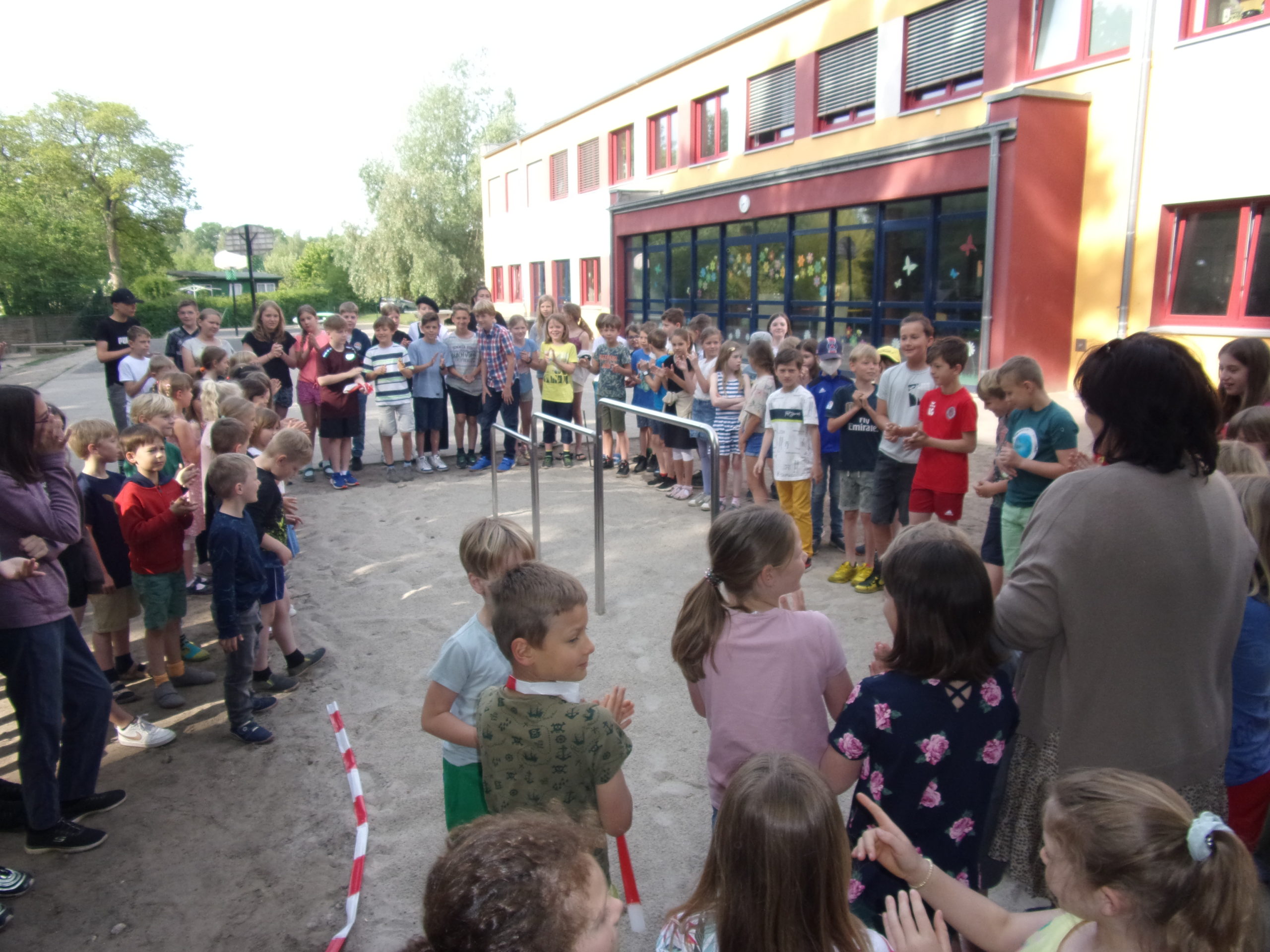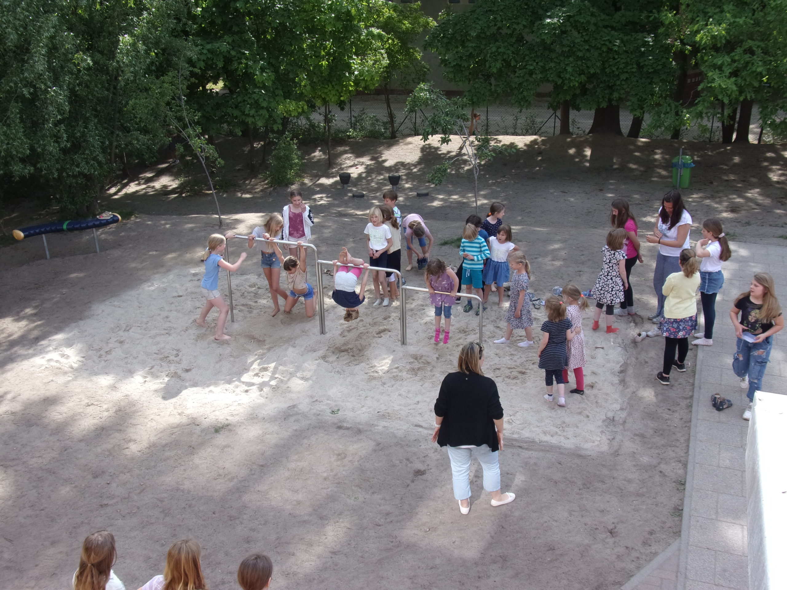 Heute haben wir an unserer Grundschule Villa Elisabeth ein neues Spielgerät auf dem Schulhof eingeweiht. Das 3er-Turnreck, welches durch die Einnahmen des Sponsorenlaufes und der Unterstützung des Fördervereins angeschafft werden konnte, wurde am Morgen durch die Schulleiterin Frau Schersching endlich freigegeben. Alle Schülerinnen und Schüler freuten sich riesig und nach einer ausführlichen Belehrung wurde das Reck in der nächste Pause auch gleich ausgiebig genutzt.