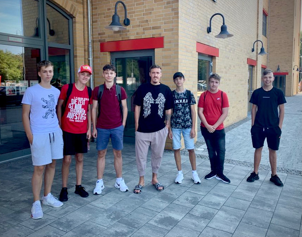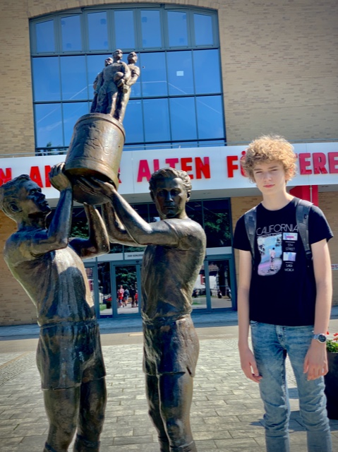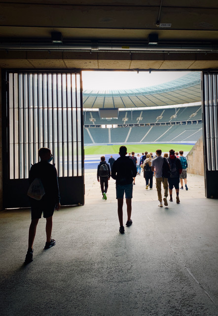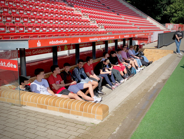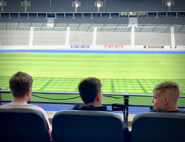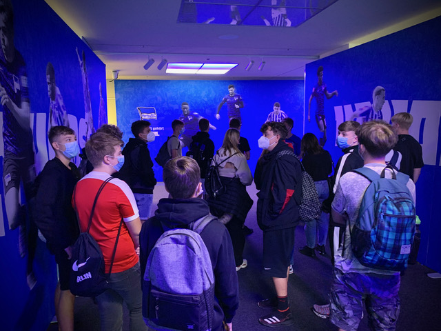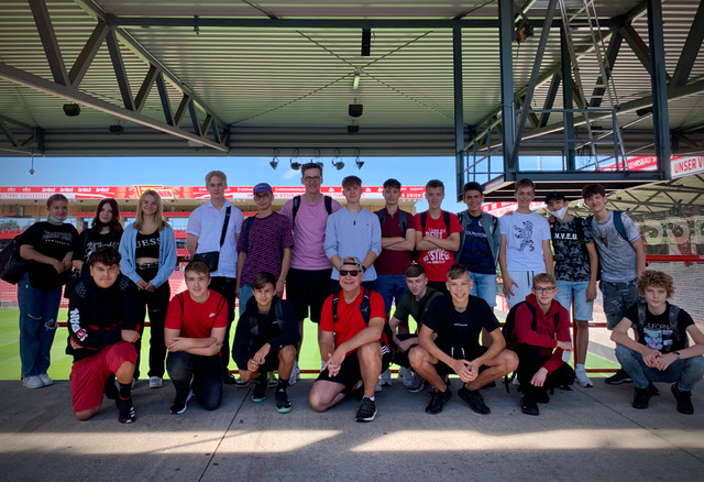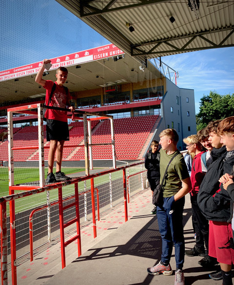 Bereits zum achten Mal wurde mit Schülern unseres Gymnasiums der Geschichte des Fußballsports in der Hauptstadt gehuldigt. In der traditionellen Projektwoche zu Beginn des neuen Schuljahres recherchierten wir zu verschiedenen Bereichen der Geschichte der beiden Berliner Bundesligavereine Hertha BSC und Union. Höhepunkte waren wieder die geführten Besuche der Spielstätten beider Klubs, welche unterschiedlicher nicht hätten sein können. Während das riesige Olympiastadion mit seiner geschichtsträchtigen gewaltigen Architektur aufwartete, war der Besuch der im Vergleich eher beschaulichen Alten Försterei in Köpenick eine fast familiär anmutende Angelegenheit. Hier trafen wir sogar persönlich auf einige Profispieler, allen voran Max Kruse, der wie auch der legendäre Pressesprecher des Vereins Christian Arbeit, zu einem gemeinsamen Foto bereit waren.