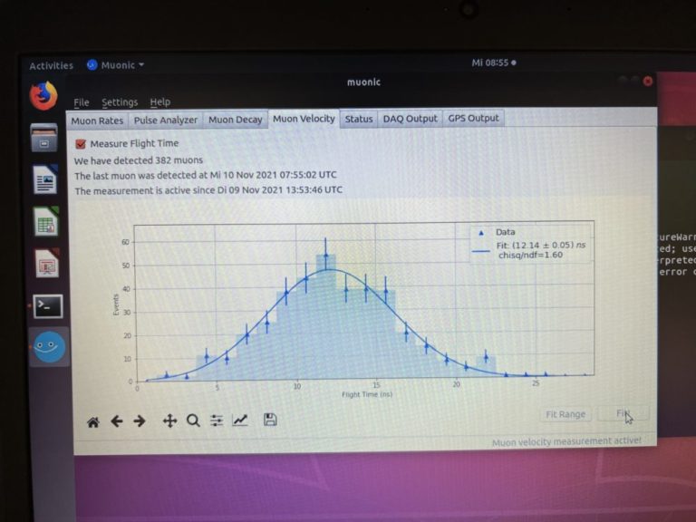 Die weiteren Experimente benötigten von Dienstagnachmittag bis Mittwochnachmittag, um genaue Ergebnisse liefern zu können. Dabei wurde einerseits die Geschwindigkeit der Myonen untersucht, die 99,9% der Lichtgeschwindigkeit beträgt (Abb. 3), sowie die Zeit, in der sich ein Myon umwandelt.