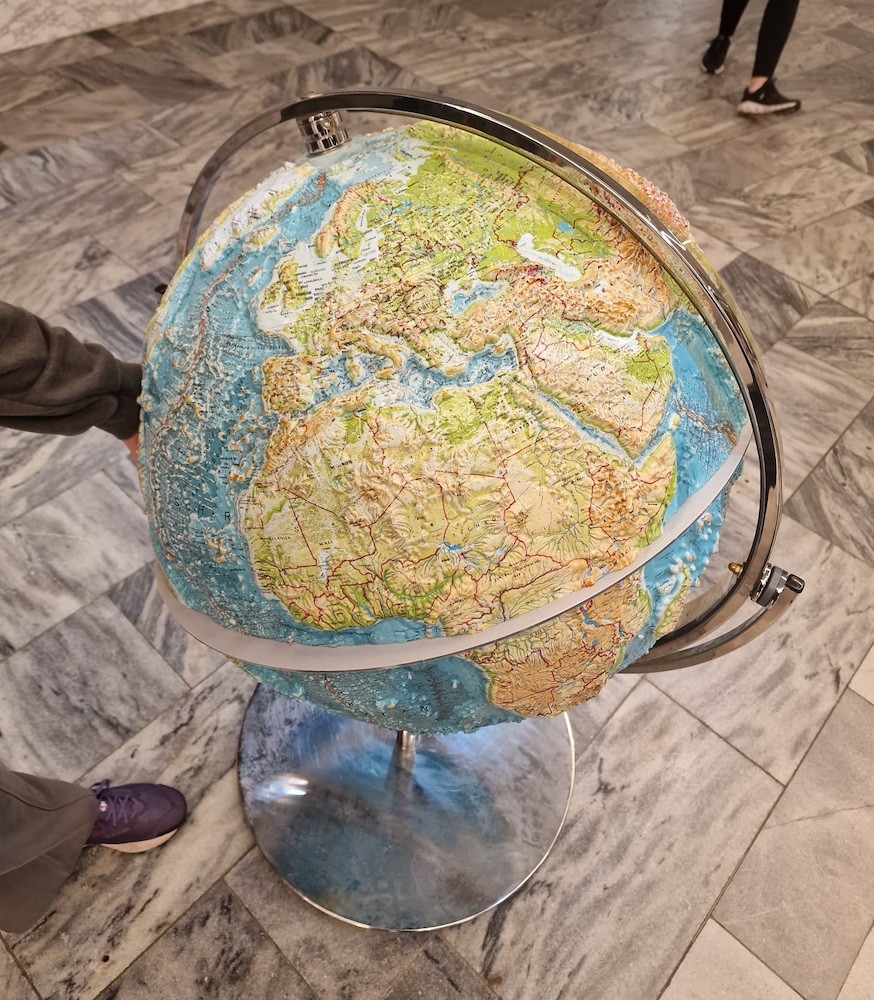 Bereits im Wartesaal des Planetariums gab es für uns einige interessante Exponate zu begutachten, darunter den alten Projektor des Planetariums sowie eine kleinere Version der „Ariane 5“ Trägerrakete und einen interaktiven Globus.