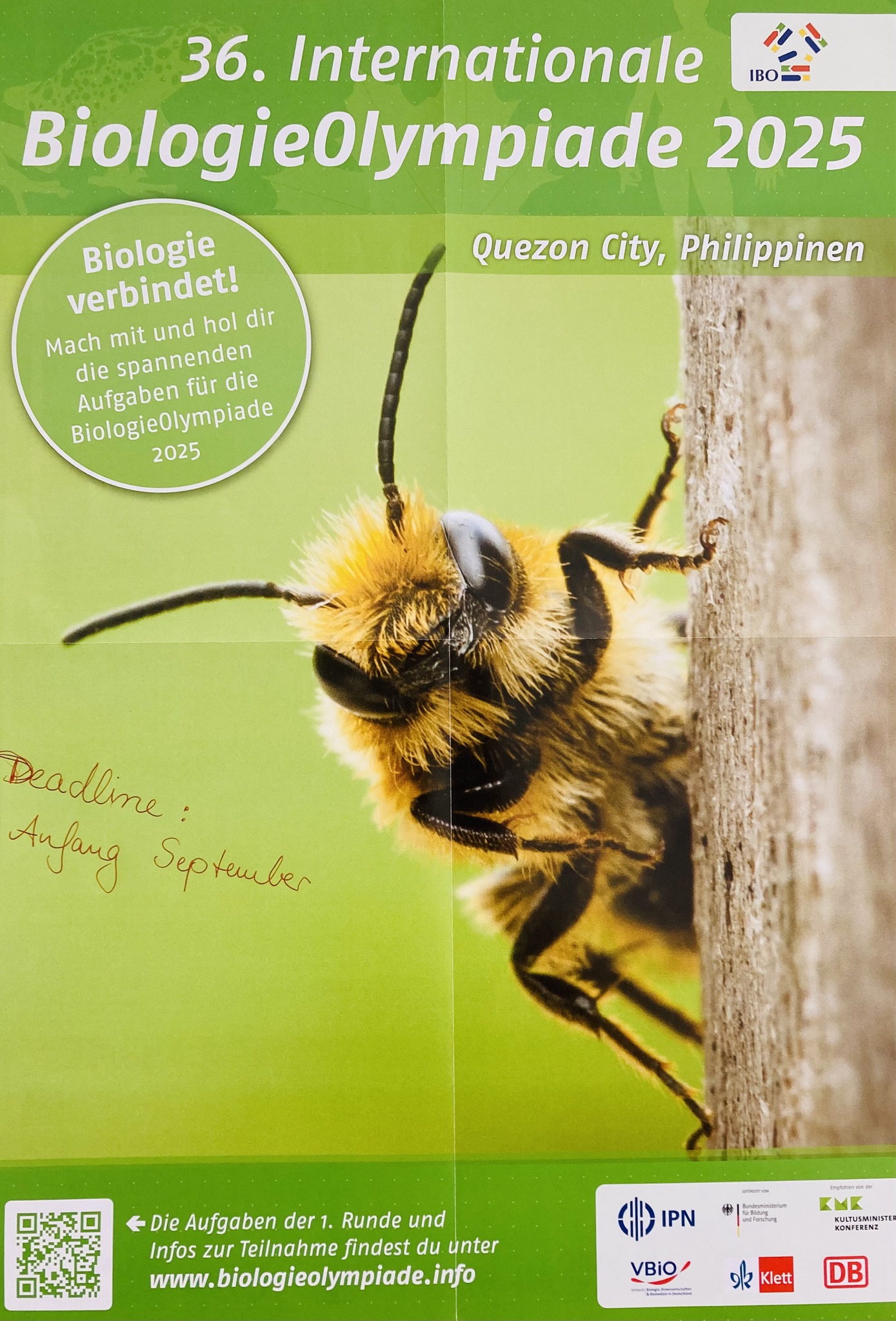 Außerdem möchten wir euch zur Teilnahme an der internationalen Biologie Olympiade und Chemie-Olympiade aufrufen. Nutzt die Sommerferien, um selbst zu recherchieren und euch auf die nächste Runde im kommenden Schuljahr vorzubereiten.