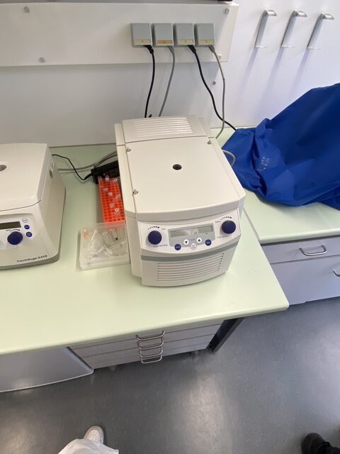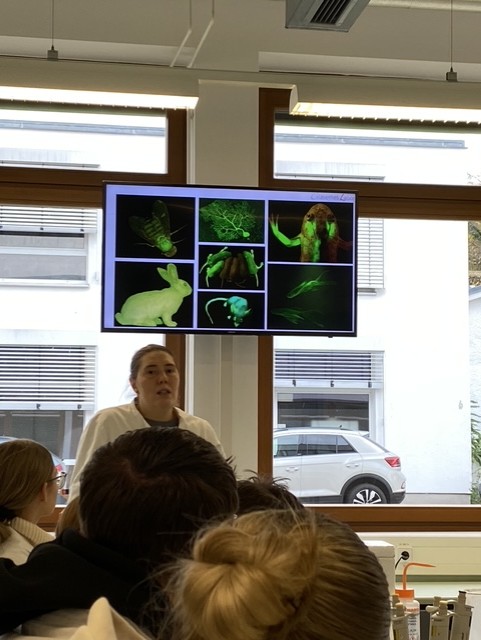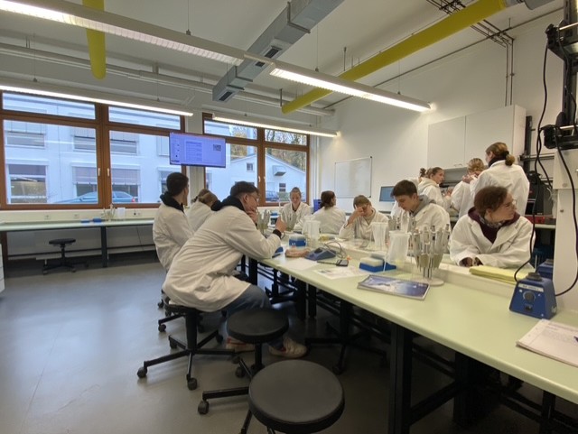 Am 18.11.24 besuchten die 12er des Biologie-Leistungskurses und des Biologie-Grundkurses das Gläserne Labor (1) in Berlin Buch, um molekularbiologische Methoden kennenzulernen und selbst durchzuführen. Hier wurde mit Mikropipetten (2), Zentrifugen (3) und Bakterienplatten gearbeitet und einzelne Schritte der Klonierung eines Gens durchgeführt. Dazu gehörte eine Transfektion von Bakterien mit einem Plasmid, das bereits das gewünschte Gen enthält, das für das Green Fluorescent Protein (GFP) kodiert (4); Schneiden des Plasmids mit Restriktionsenzymen und Auftragen auf ein Gel zur Durchführung einer Gelelektrophorese zur Kontrolle, ob das gewünschte Gen auch enthalten ist (5, 6); sowie das Ausplattieren von Bakterienzellen, zu Kontrolle, ob die Bakterien erfolgreich mit dem Plasmid transfiziert wurden – und bei UV-Bestrahlung leuchten (7).