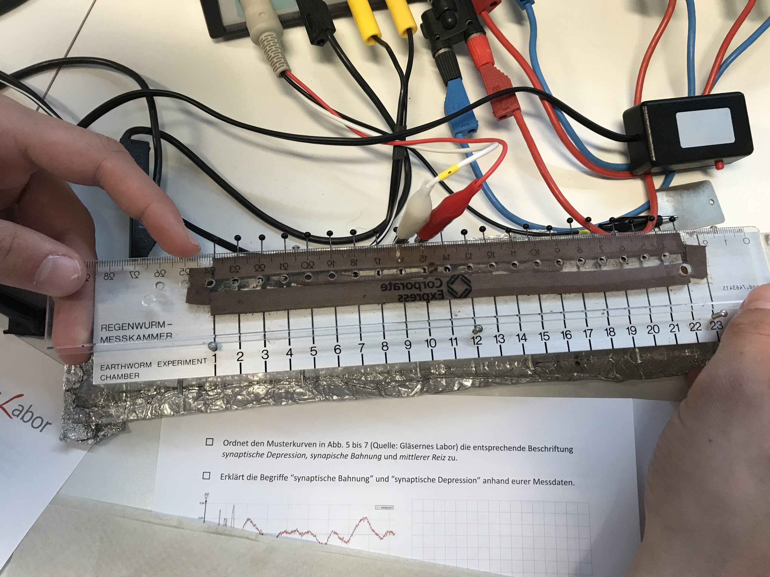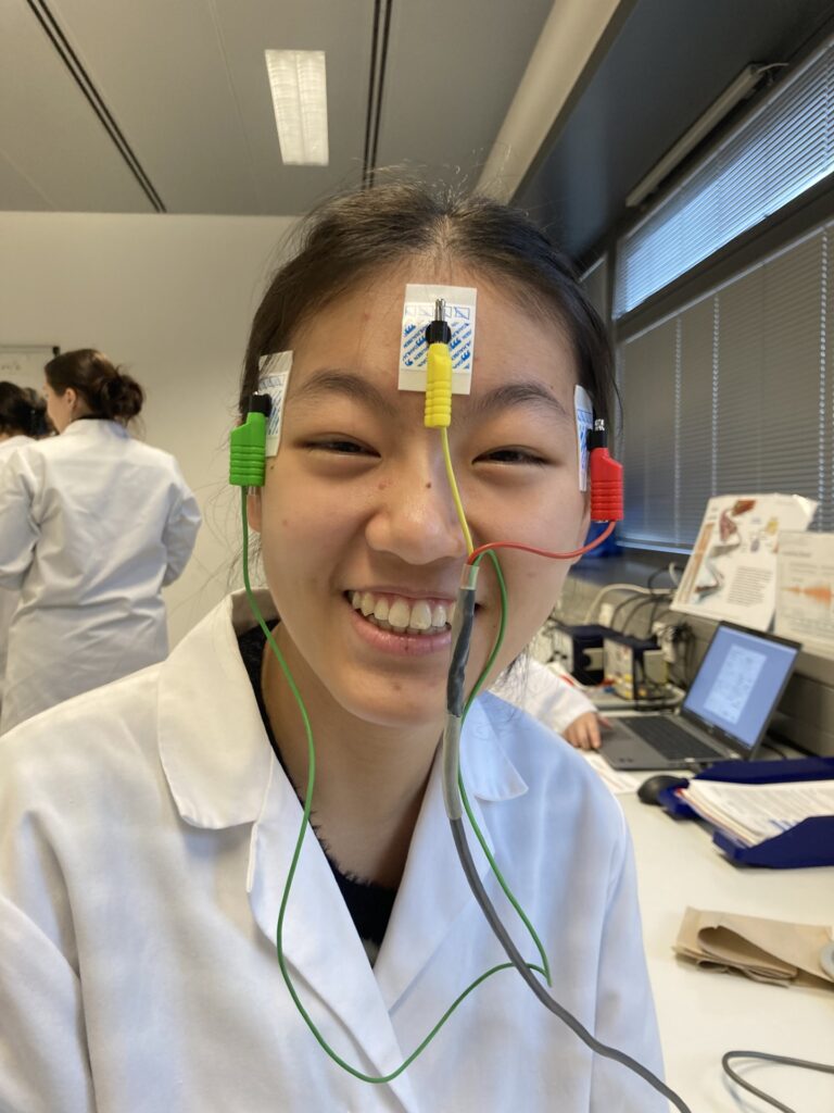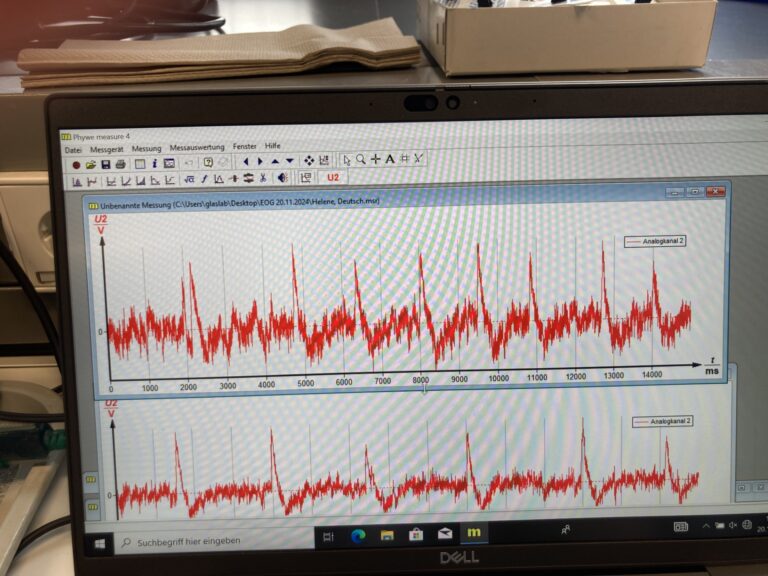 Am 20.11.24 besuchten die 11er des Biologie-Leistungskurses und des Biologie-Grundkurses das Gläserne Labor in Berlin Buch, um Experimente zur Neurophysiologie durchzuführen. Hier wurde z.B. eine sog. Ussing-Kammer mit einer omnipermeablen Membran verwendet, wobei in deren eine Kammer destilliertes Wasser und in die andere zusätzlich verdünnte Salzsäure gegeben und dann die Spannungsänderung gemessen wurde (1). In einem anderen Experiment wurde ein Regenwurm in eine spezielle Kammer gelegt und mechanisch gereizt. Über Elektroden konnten dann seine Reizweiterleitung gemessen und aufgezeichnet werden (2). In einem weiteren Experiment wurden die Muskelsummenpotenziale beim Lesen gemessen. Dazu wurden Elektroden im Gesicht angebracht (3, 4) und dann – so ausgerüstet – verschiedene Texte gelesen. Dabei kann im resultierenden Elektrooculogramm gut abgelesen werden, wann ein Zeilensprung stattgefunden hat und welche Zeit für eine Zeile benötigt wurde (5, 6). Am Ende des Versuchstages stellte jede Gruppe ihr Experiment vor und gemeinsam wurden Probleme, theoretische Hintergründe und andere Fragen besprochen und geklärt.