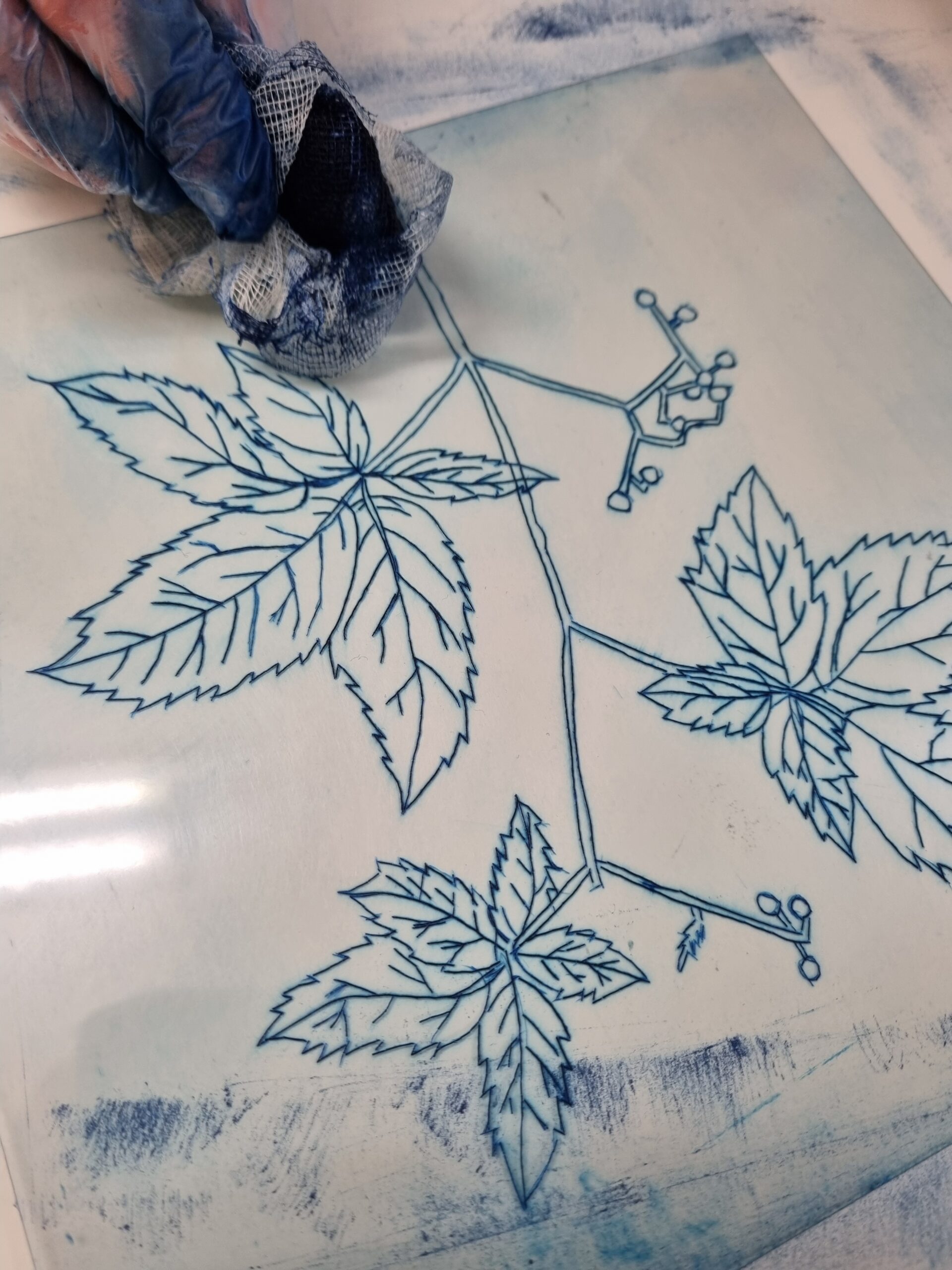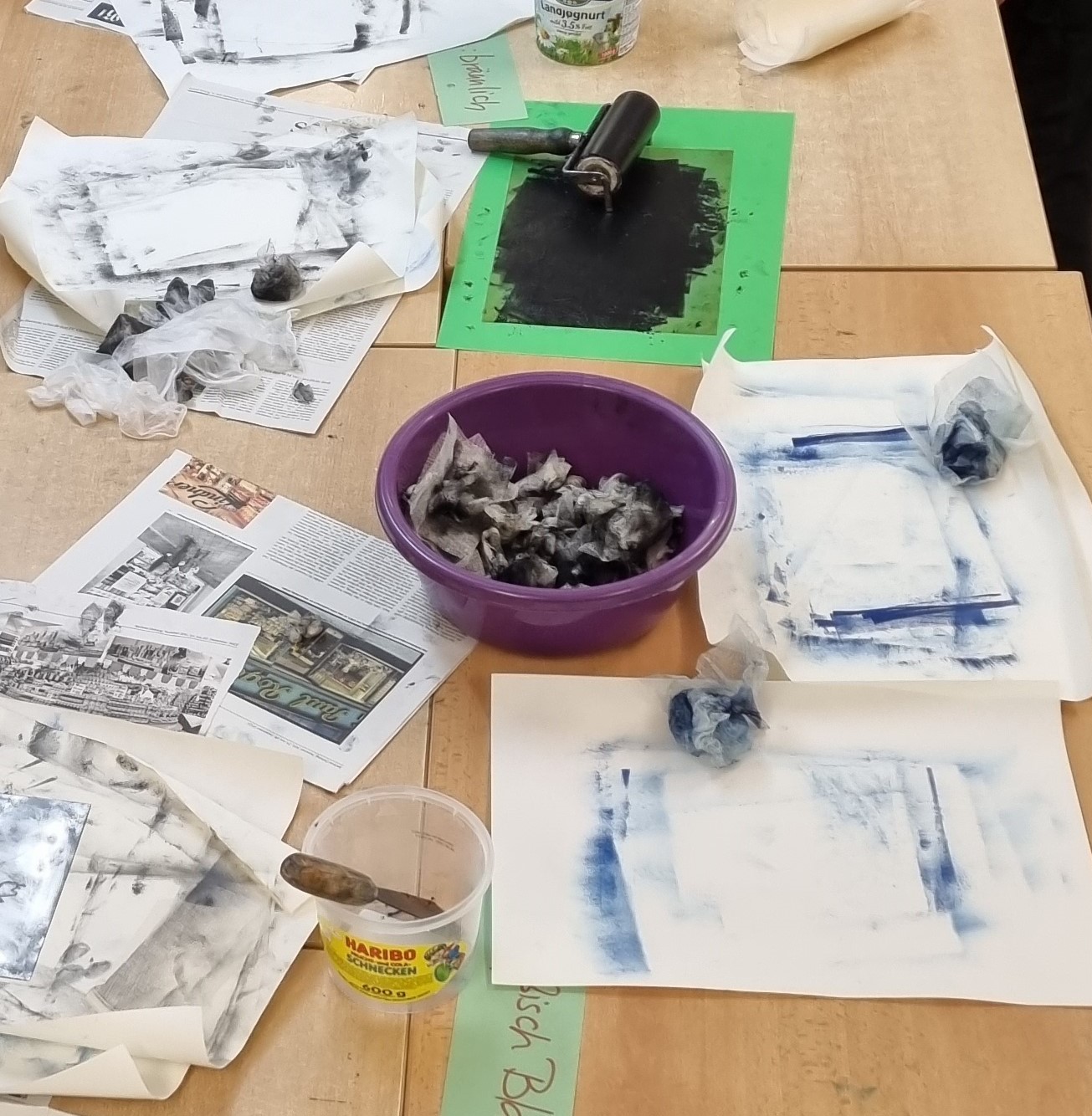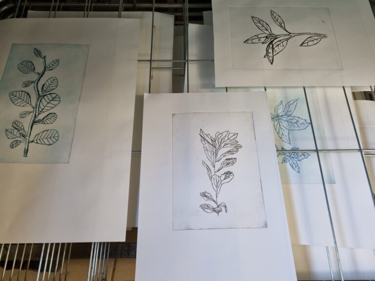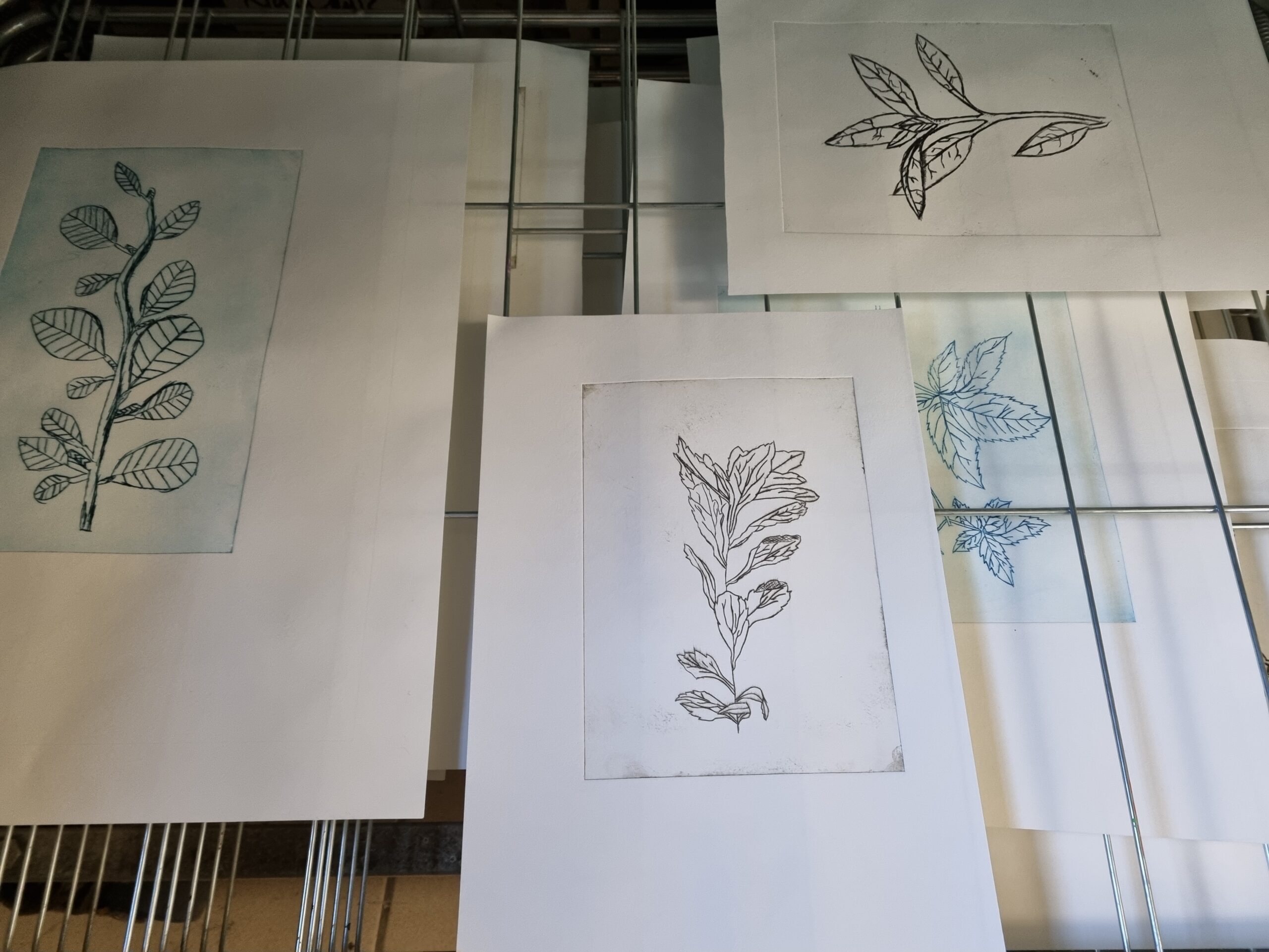 Es hört sich so leicht an: man muss ja nur ganz genau das zeichnen, was man sieht. Also: genau hinsehen, ja… und dann eben nur, äh… zeichnen! Hinsehen ist leicht, aber der Rest!? Doch die Mühe hat sich gelohnt! Die Zeichnungen von Pflanzen dienten als Vorlage für die Kaltnadelradierungen. Ein besonderer Tag: der Kunstraum als Profidruckwerkstatt, aufgeregte junge Künstler, merkwürdig müffelnde Druckfarbe in Preußisch Blau, Sepia und Braunschwarz, jede Menge Walzen, Farbfinger, Gazeknuddel… Erst Farbe auf den Druckstock, dann Farbe absolut sauber wieder runter vom Druckstock. Vorsicht, keine Fingerabdrücke hinterlassen! Warten, bis die Presse frei ist, feuchtes Papier auf den Druckstock, aber Achtung: saubere Finger! Filz vorsichtig glätten, dann drucken, gleichmäßig und behutsam, aber bitte mit Kraft! Geht alles! Und dann das Ganze wieder von vorn. Großer Aufwand und… ja: große Wirkung!!! Wenn die Zeichnung vielleicht noch nicht so richtig gekonnt aussah, die Drucke tun dies allemal! Logisch, wenn junge Künstler am Werk sind!