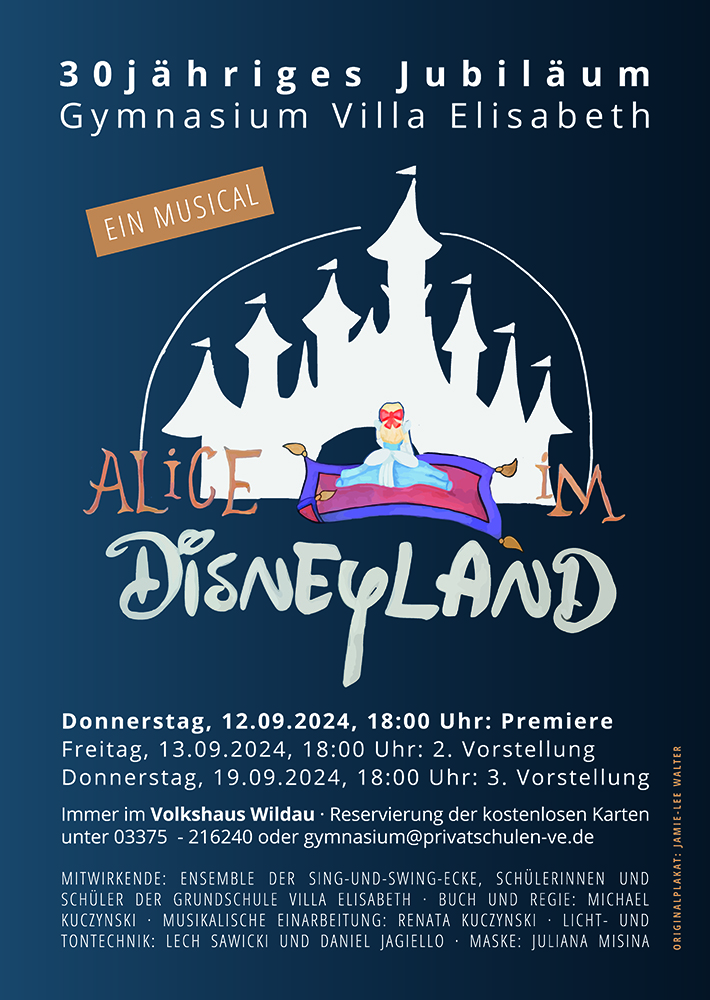 Als Geschenk zum 30-jährigen Jubiläum des Gymnasiums Villa Elisabeth führten die Schülerinnen und Schüler der Sing und Swing-Ecke das Schulmusical „Alice im Disneyland“ im Wildauer Volkshaus auf. Die liebevoll von Michael Kuczynski gestaltete Inszenierung bot magische Momente zwischen Traum und Wirklichkeit und sorgte für lachende und weinende Augen im Saal des Volkshauses Wildau.