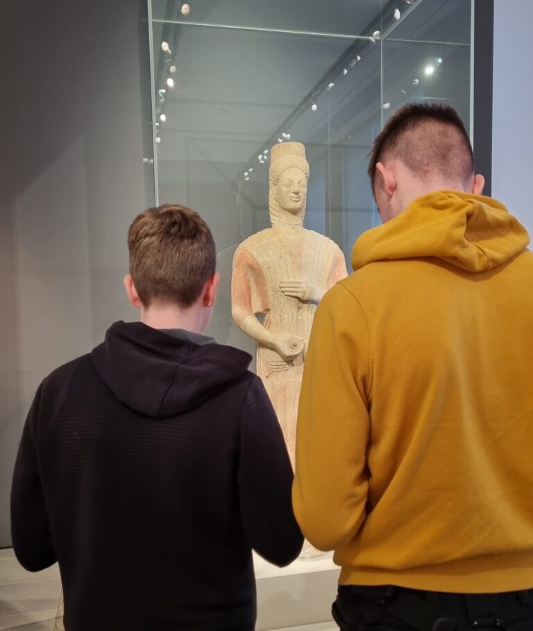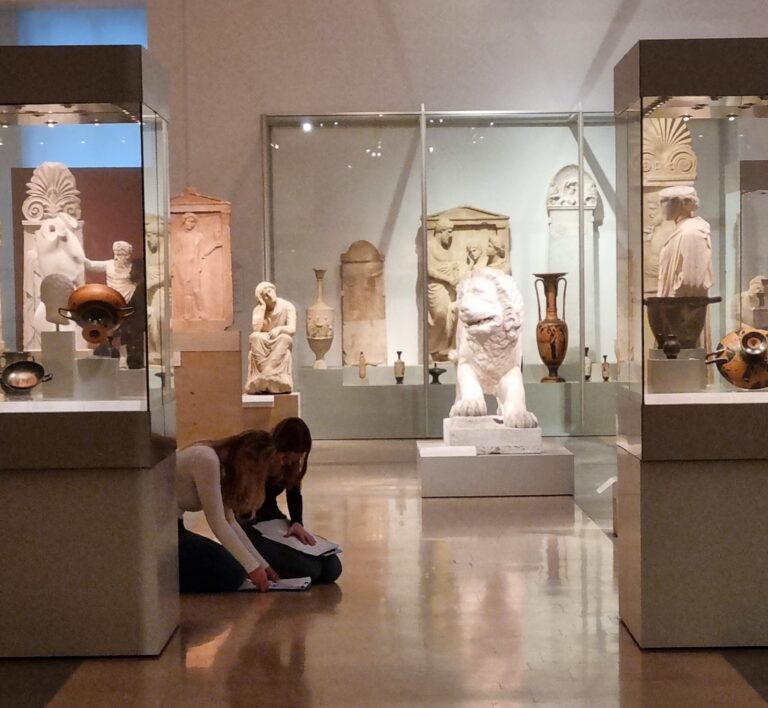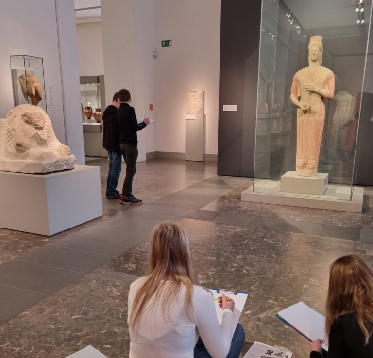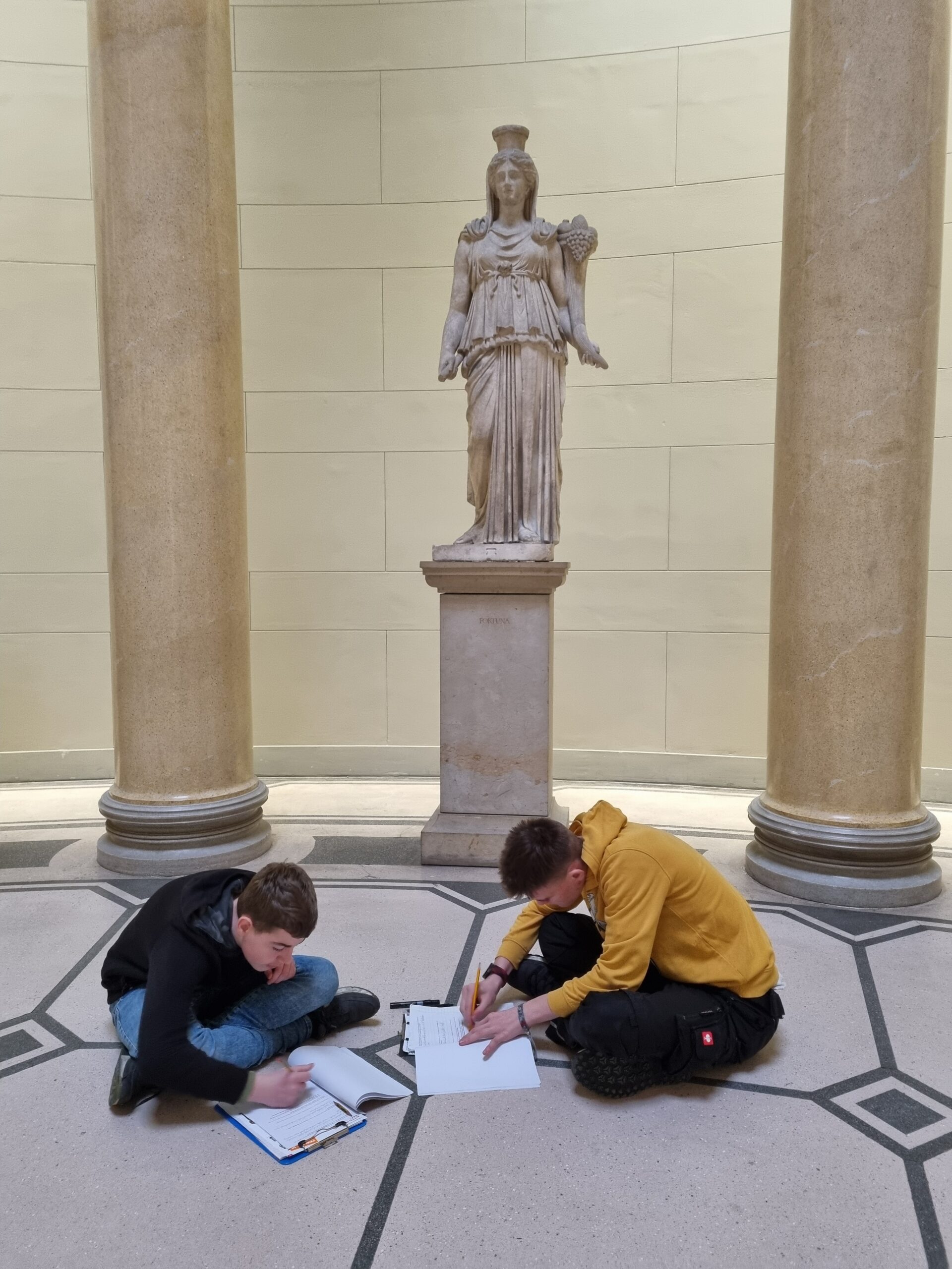 Was für ein wunderschöner Saal! Aber man muss sich auch Zeit nehmen für die Rotunde, denn nur so kann man diese Pracht auf sich wirken lassen und die Details erfassen. Der Arbeitsauftrag lautet: Genau hinsehen! Schlendert man jedoch unaufmerksam durch die Ausstellungsräume, wird man auch den kleinen Löwen ganz sicher übersehen! Nun gut, er sieht auch eher aus wie ein Mops, aber er ist ein Löwe, so steht es auf dem Schild! Und nur der aufmerksame Betrachter wird feststellen, dass die Antike wirklich bunt war, auch wenn von den Farben heute kaum noch etwas zu sehen ist. Aber das ist ja alles auch schon ewig her! Nirgends ist mehr ein leuchtendes Rot, Gelb oder Blau zu entdecken, von Quietschrosa oder Gold absolut keine Spur! Überall nur schlichtes und edel wirkendes Weiß! Aber wer ganz genau hinschaut, kann an einigen Skulpturen noch Reste der ursprünglichen Bemalung erkennen. Tja, und genau hinsehen muss man auch, um die Proportionen erfassen und dann auch noch korrekt zeichnen zu können! Nun, wenn genaues Betrachten doch schon alles wäre! Das Abzeichnen ist nämlich ganz schön schwer!