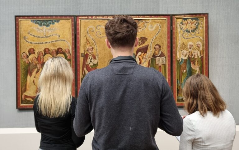 Mit dieser Frage beschäftigten wir uns im Unterricht und wissen deshalb: es gibt ganz viele verschiedene Möglichkeiten. Größenabnahme und Überdeckung kennt ja jeder, spannender sind da schon Luft- und Farbperspektive. Profis kennen nicht nur Begriffe wie Fluchtlinien und Fluchtpunkt, sondern können die Zentralperspektive auch selbst konstruieren! Die Entwicklung der Darstellung von Räumlichkeit lässt sich vor den Werken in der Gemäldegalerie in Berlin sehr gut nachvollziehen! Außerdem ging es noch um das große Thema Bildgattungen, klingt einfach, ist aber gar nicht immer alles so eindeutig. Tja, und auch die Wahl des Lieblingswerks war nicht leicht!